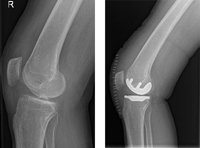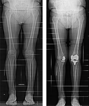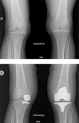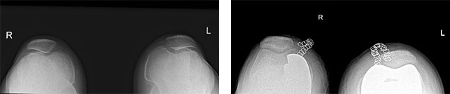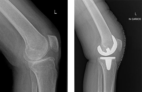 Gonartrosi bilaterale maggiore a sinistra. Intervento di protesi monocompartimentale mini invasiva a destra e protesi totale a conservazione del legamento crociato posteriore mini invasiva a sinistra. Intervento eseguito in simultanea.