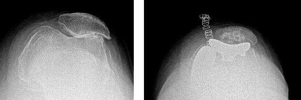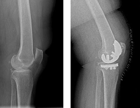 Gonartrosi sinistra. Intervento di protesi monocompartimentale mediale + protesi femoro rotulea con tecnica mini invasiva a sinistra.